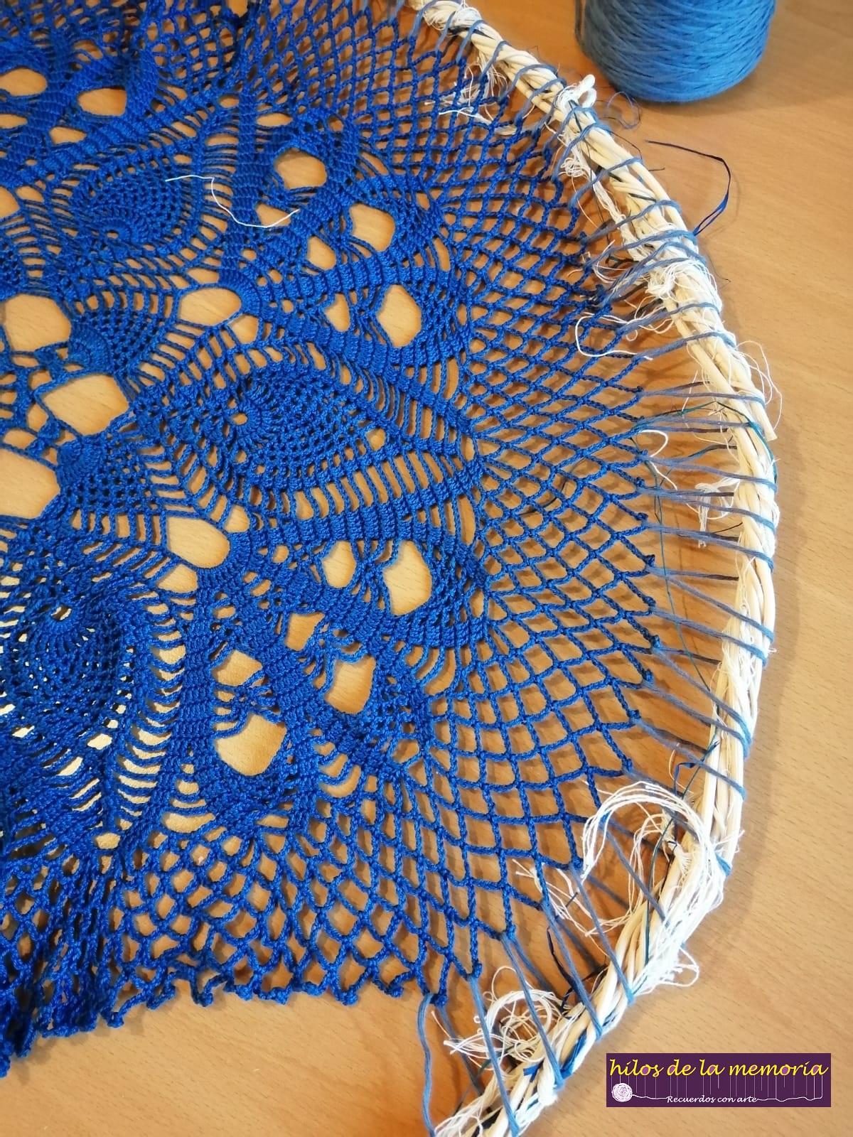 Entre todas las piezas tejidas al ganchillo que dejó mi madre estaba el paño azul de la foto, me gusta mucho y por eso quería hacer algo especial, por su color, tamaño y los motivos de piña . Mide unos 53 cms de diámetro, tiene 12 piñas, 6 más grandes y 6 más pequeñas, tejidas con diferentes puntos de ganchillo. Se puede interpretar que hay otras 18 piñas tejidas en el paño pero que no son de piñas abombadas, como las del pino piñonero, sino que son piñas alargadas, como de pino resinero. Las piñas del piñonero tienen las puntas del cono hacia el borde del paño, mientras que las piñas de resinero tienen la punta del cono dirigidas al centro del paño, agrupadas en 4 grupos de tres piñas cada uno..